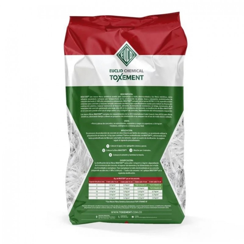 de concreto. La dosificación de fibra MAXTENTM en el concreto puede estar en el rango entre 1.8 y 3.0 kg/m3 de concreto,