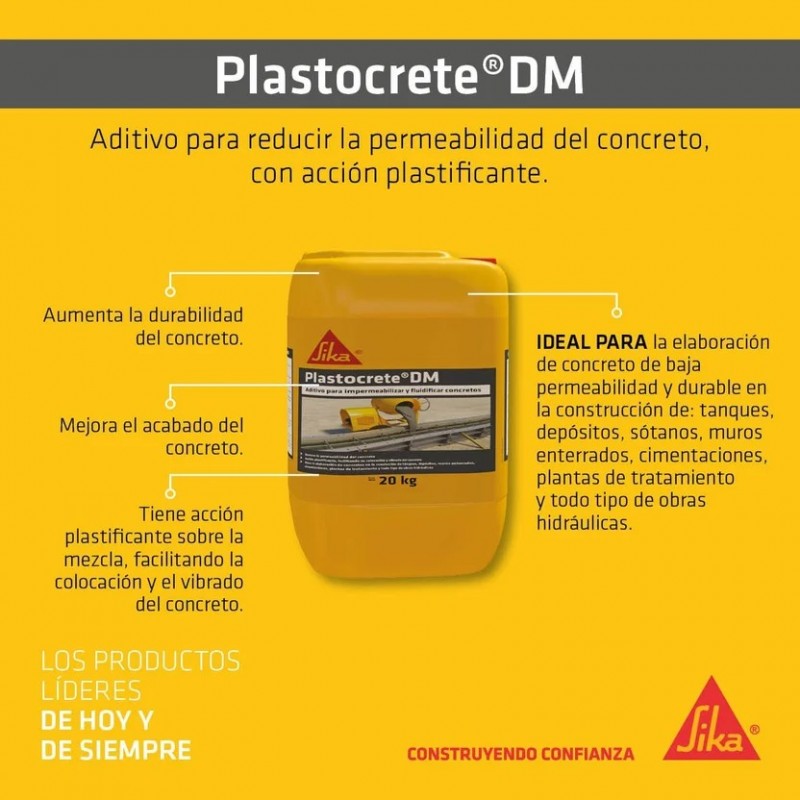 | Uso | Para la elaboración de concreto de baja permeabilidad y durable en la construcción de tanques, depósitos, sótanos, muros enterrados, cimentaciones, plantas de tratamiento, y todo tipo de obras hidráulicas. Plastocrete DM tiene acción plastifi cante sobre la mezcla, facilitando la colocación y el vibrado del concreto. Se puede aprovechar su efecto plastificante para reducir hasta en un 8% el agua de amasado de acuerdo con el asentamiento requerido. |